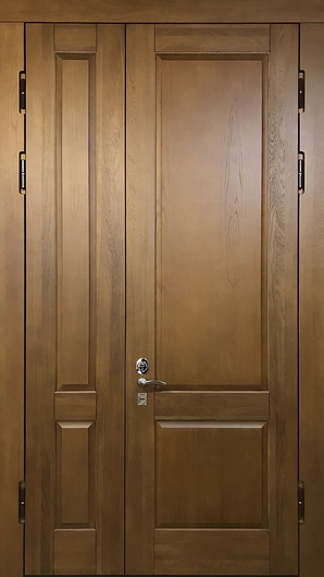 Полуторная металлическая дверь с отделкой из массива — выбор тех, кто ценит благородные материалы и долговечность. Панели из массива дерева поддерживают стилистическое единство экстерьера и интерьера. Отделка подходит как для загородного дома, так и для городской резиденции.