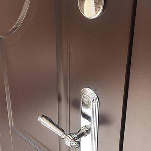 Металлическая входная группа с отделкой МДФ под темное дерево выполнена в сдержанном классическом стиле, украшена строгим карнизом и декоративным кнокером. Конфигурация включает одностворчатую дверь и две боковые вставки с тонированным стеклопакетом.
